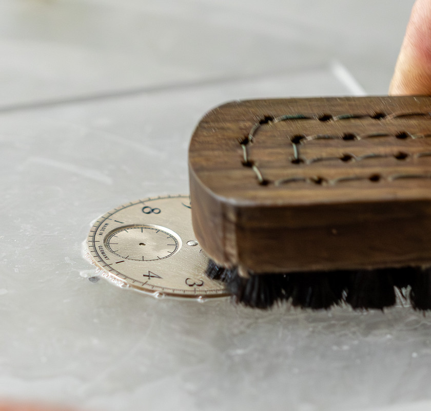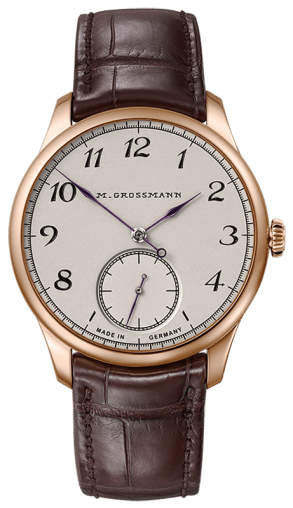 The finely grained texture of the dial is created thus – a brush is used to rub a paste consisting of silver granules, salt and tartar onto the cleaned brass dial, using a little water, until the graining appears. The engravings (numbers and the historic 1876 ‘M.Grossmann’ logo) on the dial are filled with black lacquer before being silver-plated, and the dial is then fired in a kiln. The surface is sanded to roughen it and to remove any excess lacquer so that only the black inlay remains in the engraved areas. The result is covered with a protective layer and polished. The hands are steel and hand-annealed to a violet colour.