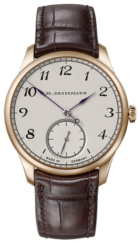 The finely grained texture of the dial is created thus – a brush is used to rub a paste consisting of silver granules, salt and tartar onto the cleaned brass dial, using a little water, until the graining appears. The engravings (numbers and the historic 1876 ‘M.Grossmann’ logo) on the dial are filled with black lacquer before being silver-plated, and the dial is then fired in a kiln. The surface is sanded to roughen it and to remove any excess lacquer so that only the black inlay remains in the engraved areas. The result is covered with a protective layer and polished. The hands are steel and hand-annealed to a violet colour.