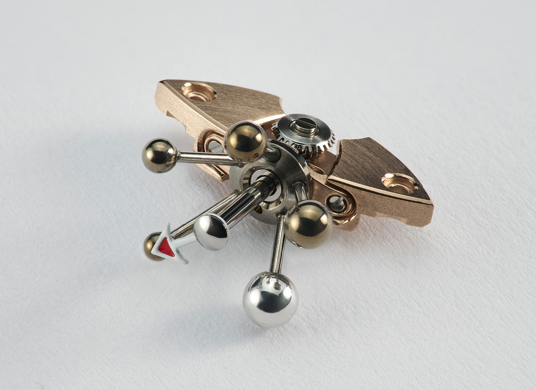The first section (‘room’) tells the time in hours and minutes via rod-mounted orbs which serve as hour markers and red-tipped arrows serving as hour and minutes hands. Larger lighter aluminium orbs mark quarter hours and darker polished titanium orbs are used for the other minutes. The second section has a power display which also has a red-tipped arrow as a marker. A third section has, unexpectedly for MB&F, a thermometer on a bimetallic strip which you can have in either C or F. The final section is the MB&F battle-axe logo set into sapphire crystal. Pulling this out enables time setting.