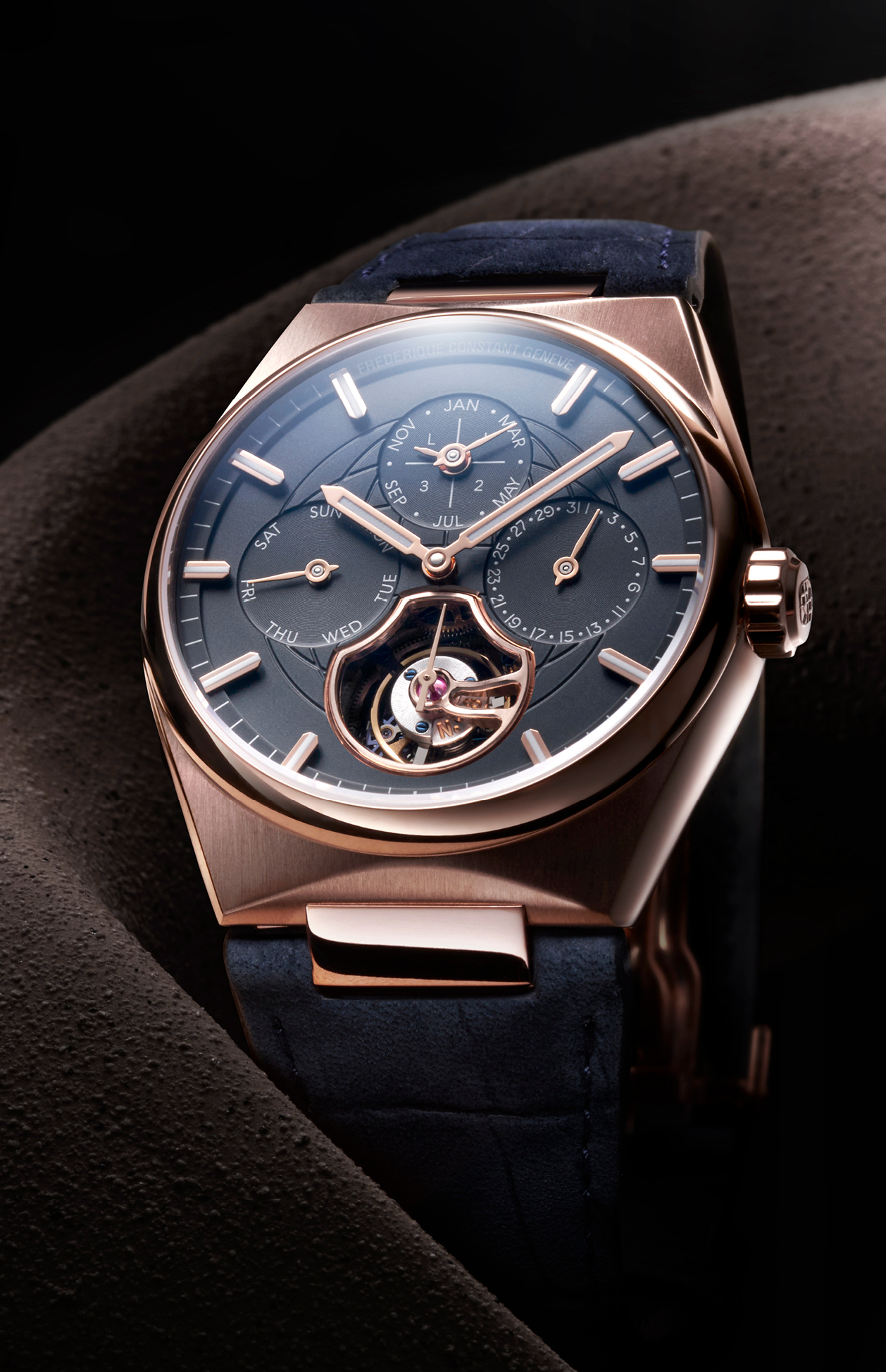 To mark thirty-five years of the brand, and fifteen years of its Manufacture tourbillon, they have just announced another new limited edition Tourbillon Perpetual Calendar in an 18kt rose gold case with a solid matte blue dial with an embossed stylised globe pattern.