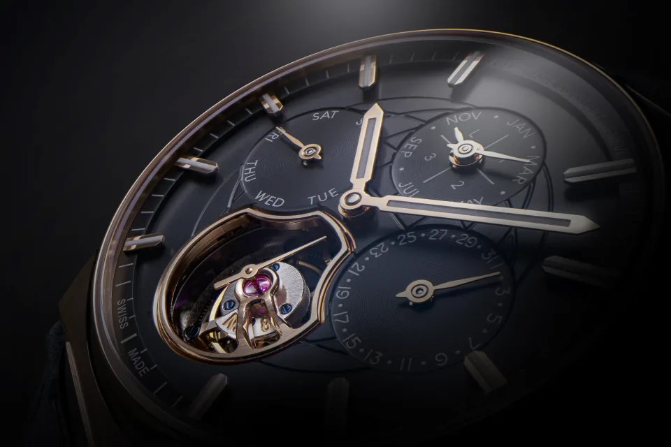 The blue dial features rose gold-plated hour and minute hands and applied indices, all of which also have Super-LumiNova. Alongside the 60-second tourbillon at 6 o’clock which has a rose-gold plate seconds hand, the day, date and month indications are at 12, 3 and 9 o’clock respectively. There is leap year counter (marked ‘L’) at the month indication at 12 o’clock. The tourbillon has blued screws and a gold bae plate that has the watch’s serial number.