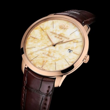 Surrounding this is a pink gold 40mm case with a thickness of 9.4mm and water resistance of 30m. On the sapphire of the open case back is the Château Latour logo. Beneath it is the automatic Calibre GP03300 which beats at 28,000 VPH and has a power reserve of 46 hours. Its oscillating weight is pink gold and finishing includes circular graining, Côtes de Genève, mirror-polishing, snailing, and satin and sunray finishing.