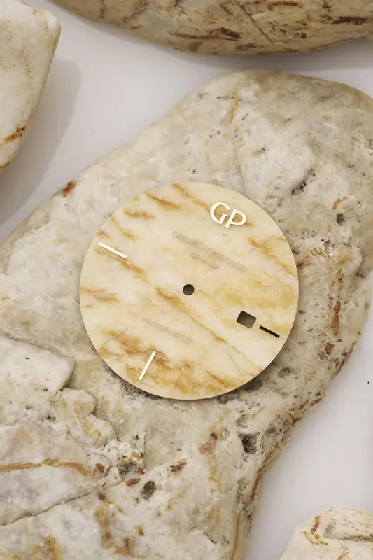 The dials of this new watch are made from pebbles from Château Latour’s vineyard. Rather than taking Tissot’s approach, the pebbles chosen are all of a similar pale colour, but because of the material used, each dial is different. It takes thirty hours to create each dial, which is 0.45mm thick.