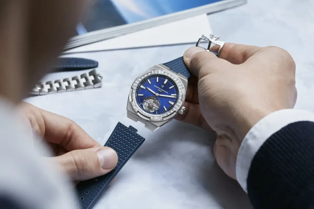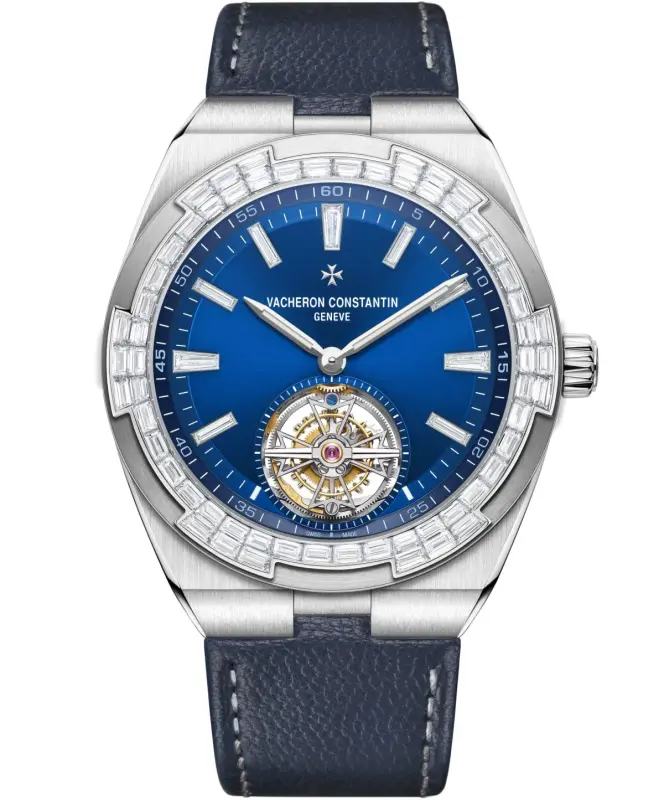 Vacheron Constantin’s Overseas tourbillon gets the high jewellery treatment, with a new model combining white gold and a blue dial with baguette-cut diamonds.