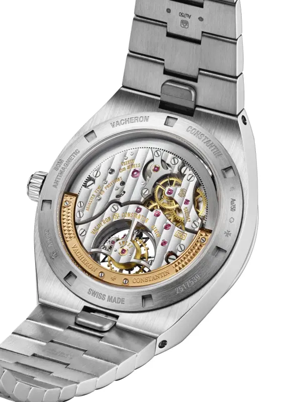Through the open case back can be seen the automatic Calibre 2160 which beats at 18,00 VPH and has a power reserve of 80 hours, thanks to a 22k gold peripheral rotor. The rotor placement, which means that the axis of rotation is not central, is to make the movement thinner. Finishing consists of a circular-grained mainplate, Côtes de Genève on bridges, and frosted wheels.