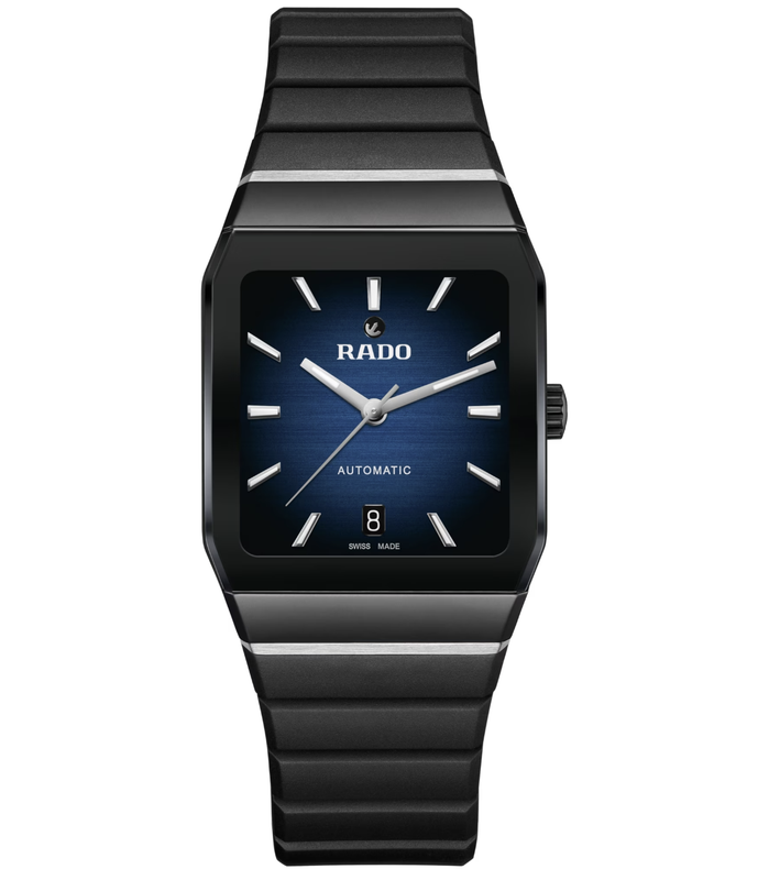 With a horizontal satin-brushed background, the lacquered gradient dial comes in three launch colours – green to black, blue to black, and cognac to black. The rhodium-coloured hands and applied markers are filled with white Super-LumiNova. The rhodium anchor logo is on a black background and the Rado logo and ‘Automatic’ text are printed. The background of the date window is black, so as to blend in with the gradient colouring.