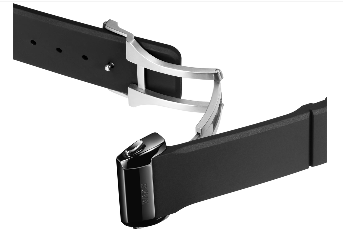 A textured black rubber strap attaches to the case via horizontally satin-brushed end pieces. It has a brushed stainless steel three-fold clasp with a matte black ceramic cover.