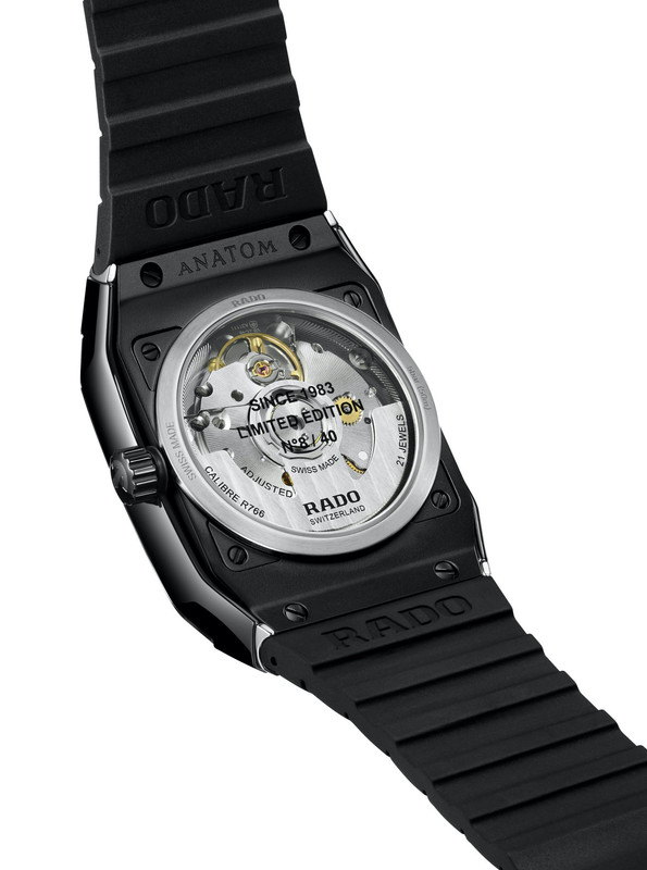Through the open case back can be seen the automatic Rado Calibre R766 which beats at 28,800 VPH and has a power reserve of three days.