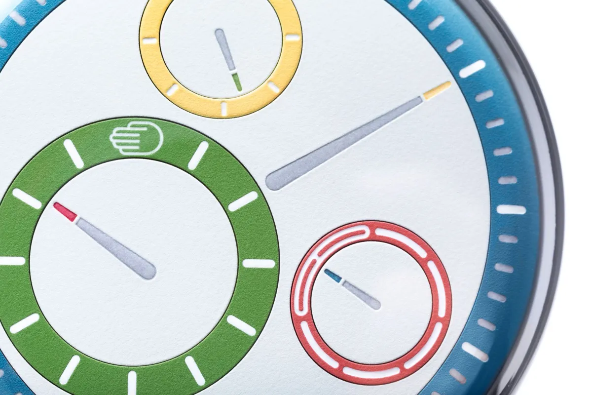 It’s all about bold colours for new Type 1 Round. The German silver dial features red, blue, yellow, and green for the function discs, on a light grey dial. The hands are a darker grey compared to the dial, with tips in the same four colours but contrasted to the function colour, and Super-LumiNova®. Numbers and indices are painted white and the engraved indications also have Super-LumiNova®.