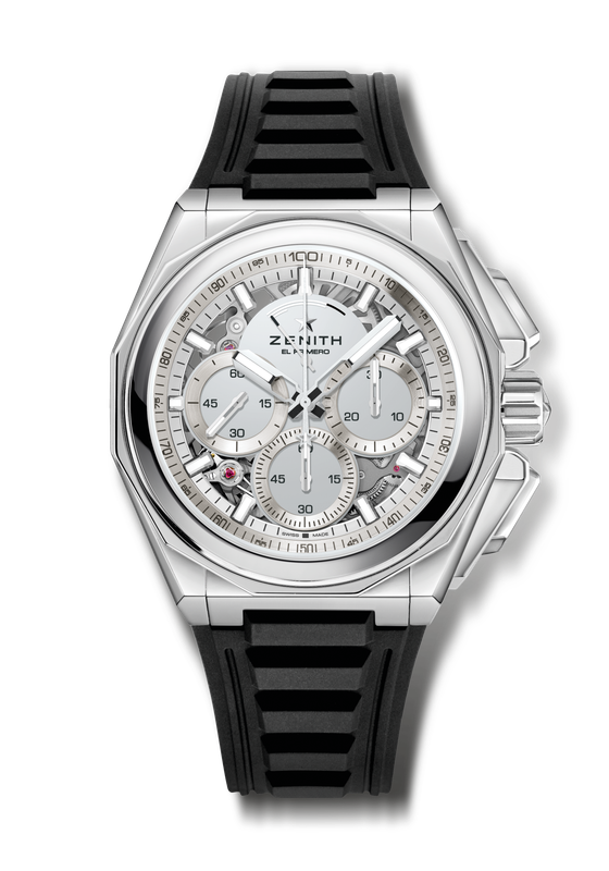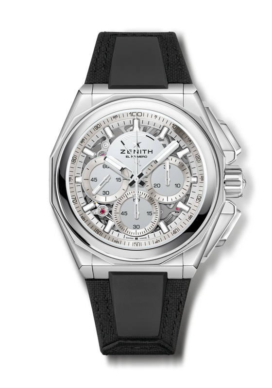 Visible through the open dial, and more so through the open case back is the chronometer-certified automatic high-frequency chronograph El Primero 9004. The 1/100th of a second time measurement of the fastest automatic high-frequency chronograph movement is achieved by means of two independent escapements beating at the rates of 5Hz (36,000 VPH) for timekeeping and 50Hz (360,000 VPH) for the chronograph. The power reserve is fifty hours for the timekeeping function and fifty minutes for the chronograph. The rotor is finished in a silvery-grey metallic tone and has satin finishing.