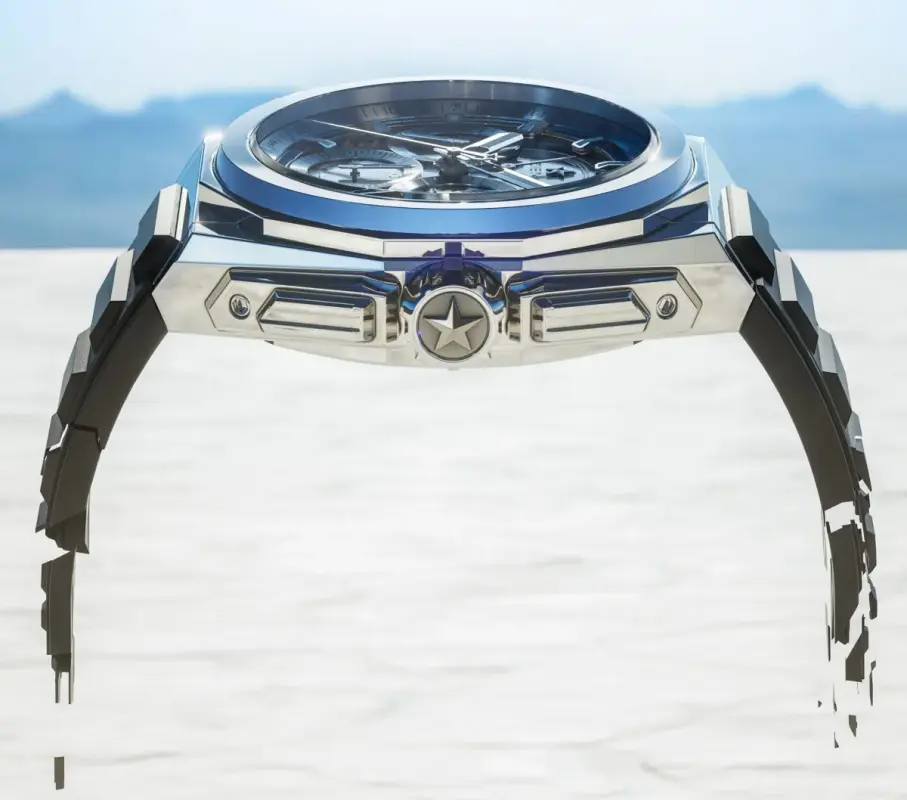 The open dial is sapphire, multi-layered, and with a metallic mirrored finish that is intended to reflect its surroundings. The 1/100th of a second chronograph scale features satin-brushed metallic elements. The counters are silver-colored.