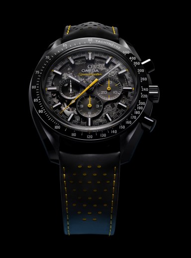 Coming on a black rubber perforated strap with a yellow inner layer and stitching, to colour-match to the chronograph hand, the Australian RRP for the Omega Dark Side of the Moon Apollo 8 is $23,650.