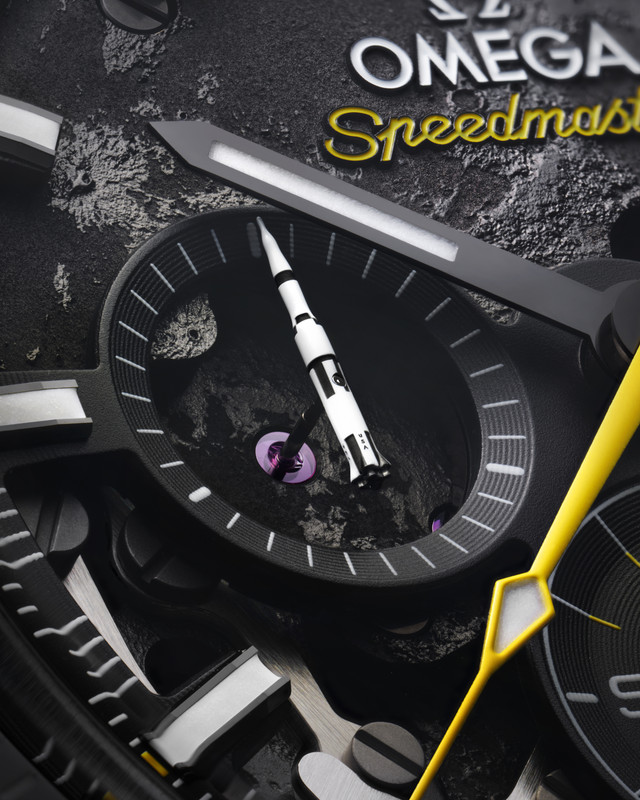 The central chronograph seconds hand is varnished yellow, but the fun thing (and major selling point) about this new model is the patent pending small seconds hand at 9 o’clock. Made from grade 5 titanium, it is a miniature Saturn V rocket, created by laser turning and with white varnish, ablation and laser blackening responsible for the decorative part.