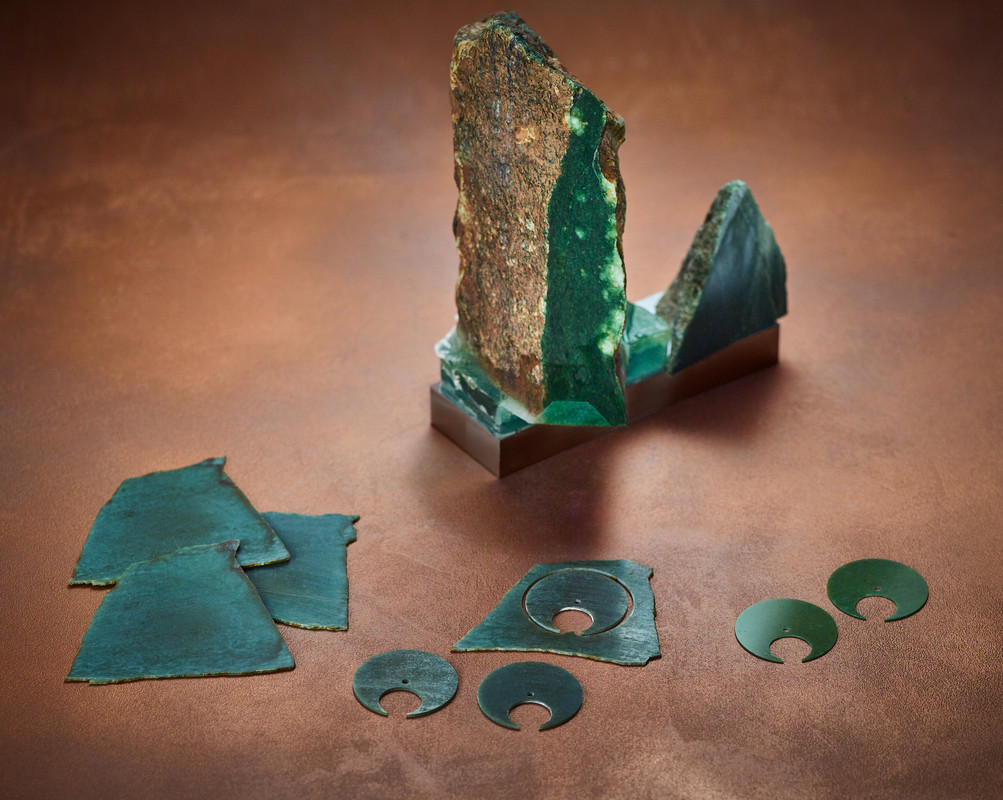 You may already be familiar with how stone becomes a dial, but to recap – the first step is obviously selecting the jade. It is then cut using CNC equipment to pieces that are between 1 and 1.2mm thick. These are then individually cut into the dial shape and glued onto metal plates, after which there is more CNC milling and refining. The final step is hand polishing, before varnish is applied to the back and the dial glued onto a brass base.