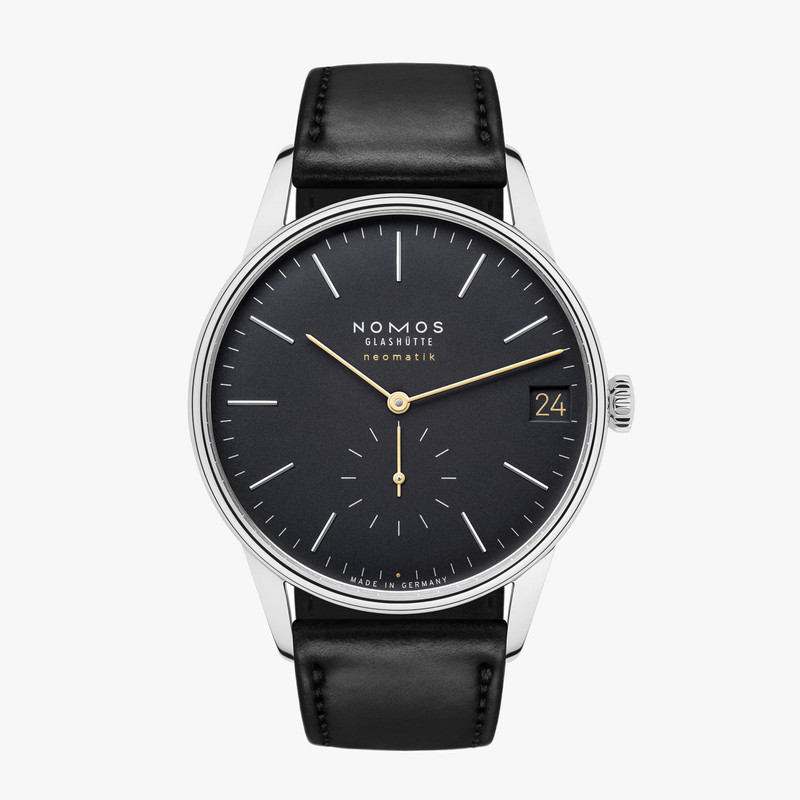 The third and final new model in black is the Orion neomatic 41 date new black, which comes in a 40.5mm case with a thickness of 9.4mm. Its galvanised dial features gold hour, minute and seconds hands, along with a mix of rhodium-plated and stamped markers. Unlike the other two models, this one has a date function – the date window at 3 o’clock has gold numbers against a black background.