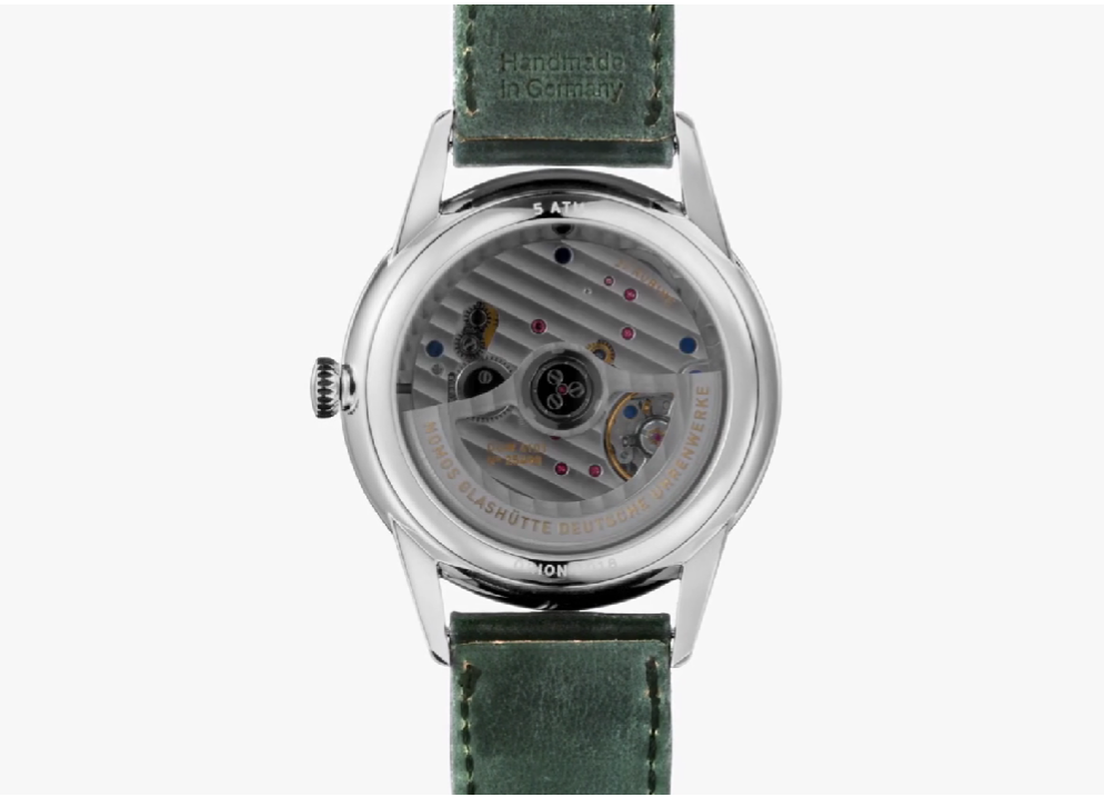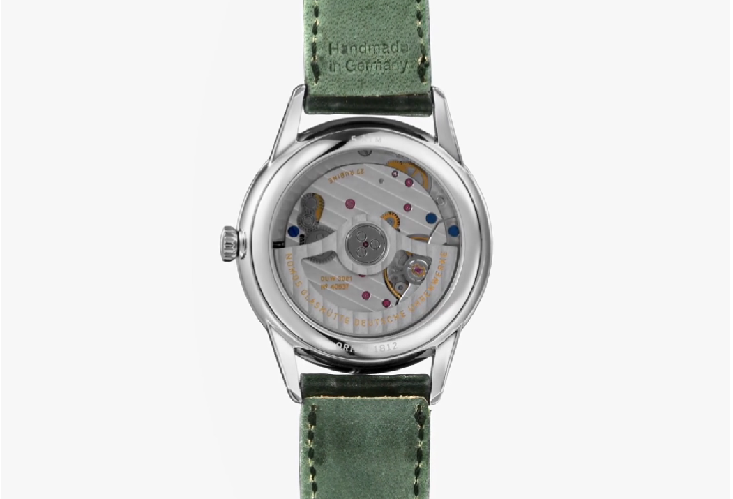 Behind the open case back is the in-house automatic DUW 6101, in which the date ring is placed around the movement, with a power reserve of 42 hours. It has a Glashütte three-quarter plate, blued screws, and rhodium-plated surfaces with Glashütte ribbing and NOMOS perlage.