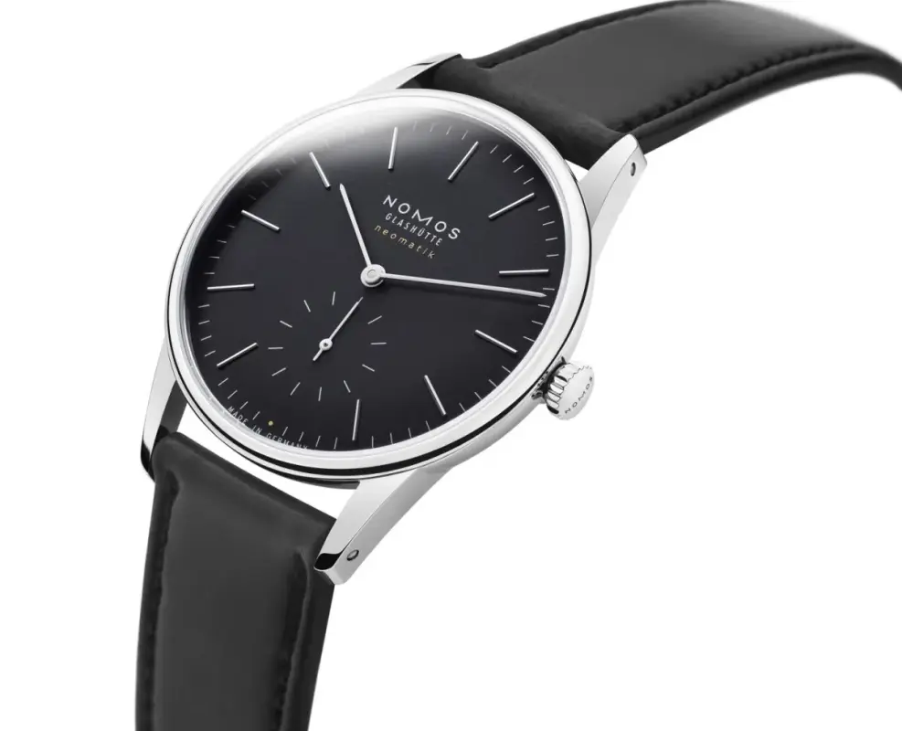 Now, NOMOS Glashütte brings black to its Orion neomatik collection, completely changing the Orion into an even more elegant dressy watch with a galvanised black dial. This new range consists of automatic watches in three variants – in 36.4mm, 38.5mm, and 40.5mm sized stainless steel cases with silver or gold accents on a slightly curved black galvanized dial.