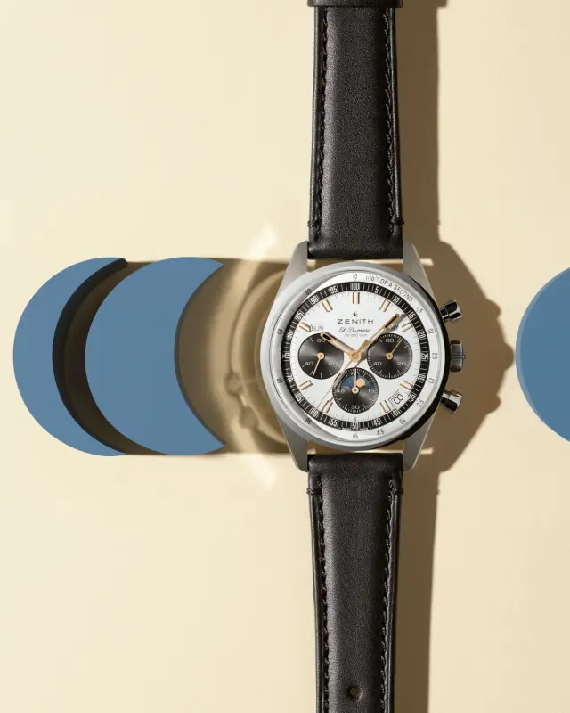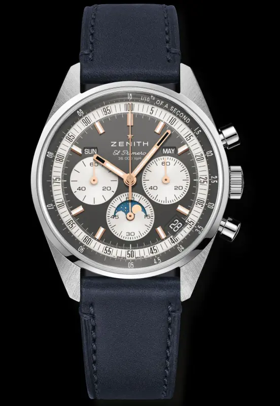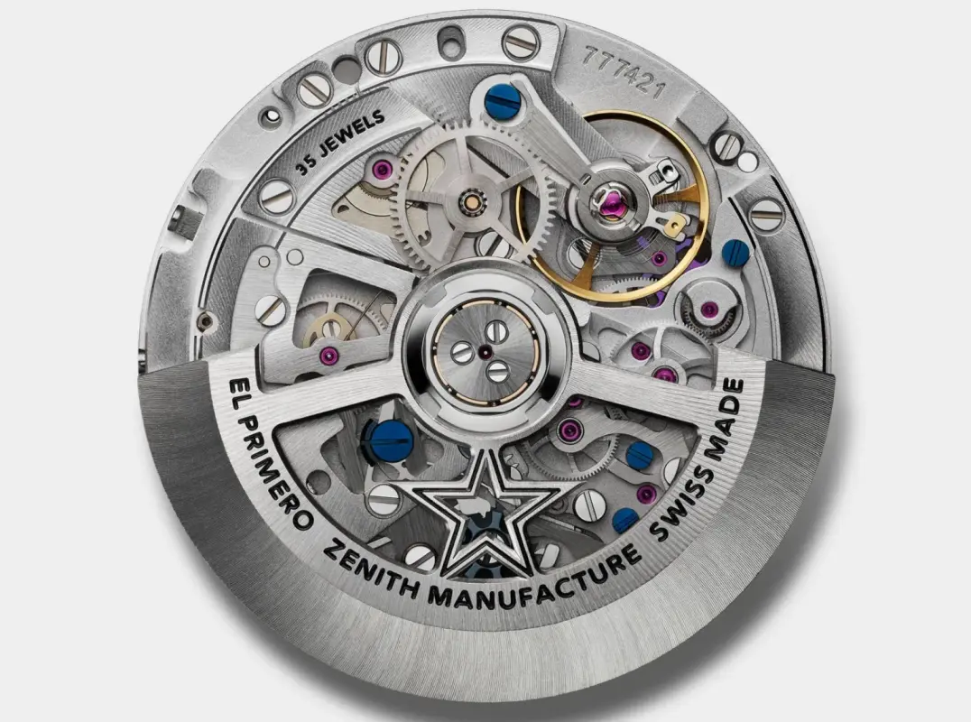 Powering the new Triple Calendar is the newest generation of the El Primero 3600. With a Zenith star rotor and a blue column wheel, the El Primero 3610 beats at 36,000 VPH/ 5Hz with a 60 hour power reserve.