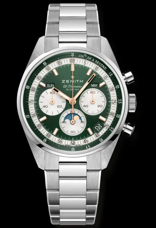 That first El Primero triple calendar chronograph did eventually join the movement family, and this complication has kept its (periodic) presence at Zenith, but this new Chronomaster Original manifestation combines the brand’s automatic high-frequency chronograph calibre with a triple calendar and moon phase in a retro A386-tastic 38mm stainless steel case with a mix of polished and brushed finishing.