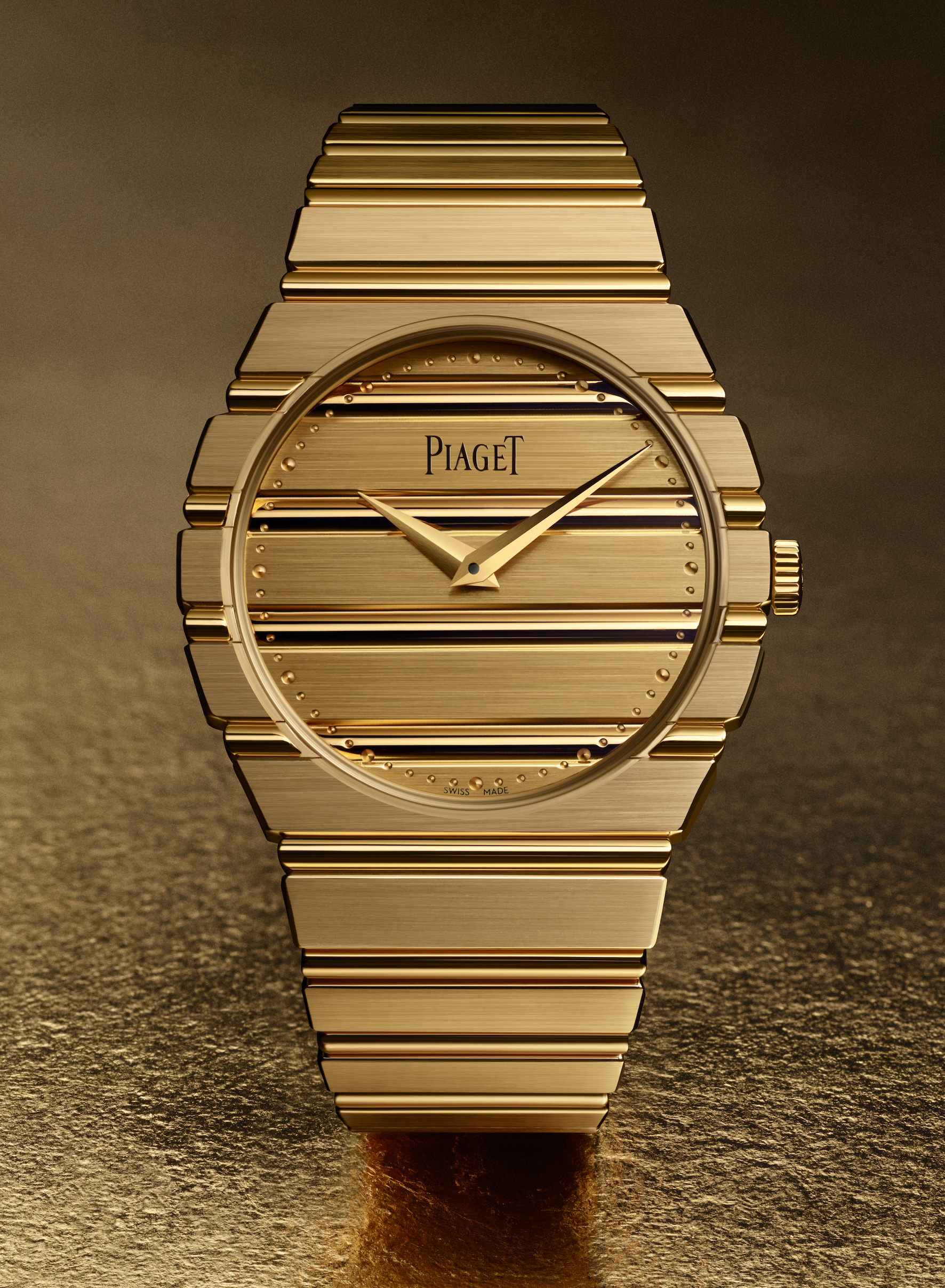 With the new Polo 79 looking so much like the original, there are still some differences. At first glance, the ‘all about the gold’ design of a brushed 18kt yellow gold dial with polished alternating gadroons and dial striations create the same design cohesiveness between the 18k yellow gold case, dial, and integrated bracelet with brushed block bracelet links are as the 1980s intended. The ‘Piaget’ on the dial is also in the original period font.