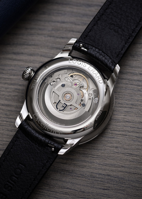 Visible through the open case back is the automatic Sellita SW261-1 which beat at 28,800 VPH and has a power reserve of 38 hours. It has an open-worked oscillating weight with a black lacquered Louis Erard symbol.