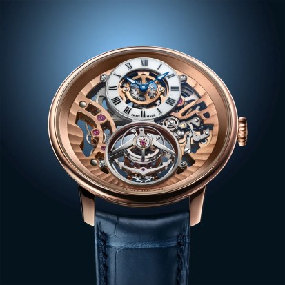 The Ultrathin Tourbillon Skeleton 41.5mm Red Gold comes on a blue alligator strap with black alligator lining and the Ultrathin Tourbillon Skeleton 41.5mm Platinum, on a brown alligator strap with black alligator lining. The folding clasp for the latter is platinum and fdor the Red Gold model, titanium.