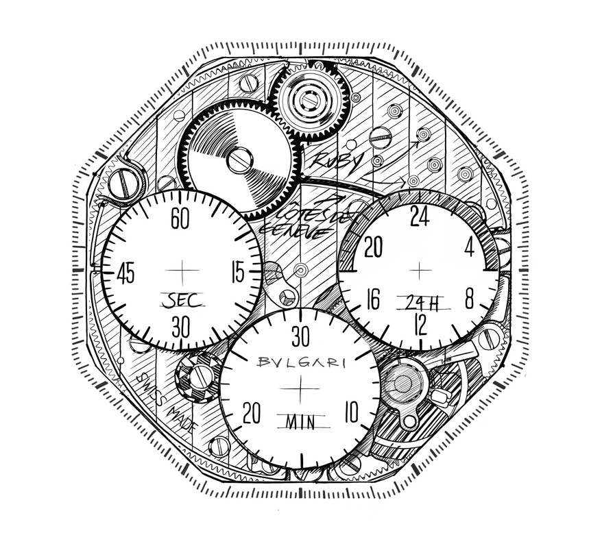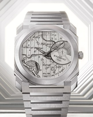 There is a third Sketch model that will be released at a later date and for which Bulgari have only released one image – the Ref 104192 Octo Finissimo Chronograph GMT Sketch. In a tri-compax format, it will have a central seconds hand, 30-minute chronograph, second time zone at 3 o’clock, and small seconds at 9 o’clock. It will be in a 43mm steel case with a mix of polished and satin-brushed finishing.