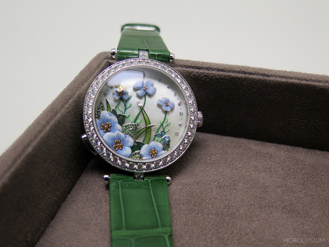 The Lady Arpels Brise d’Été comes in a 38mm white gold case, with a diamond bezel. Materially, the watch has a mother-of-pearl dial, and tsavorite and spessartite garnets (pistils). Enamelling ranges from plique-à-jour (blades of grass) and champlevé (leaves), to vallonné (corolla flowers).