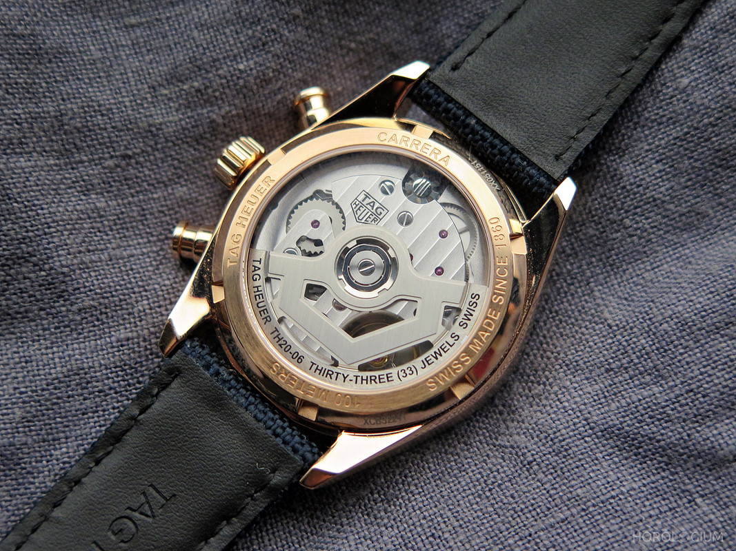 Beneath the screw-down open case back can be seen the in-house Heuer 02 (Ref. TH20-06), a column wheel chronograph movement with 80 hours of power reserve, and a version of the Heuer 02 adapted for regatta timing. It has a bi-directional TAG HEUER shield-shaped rotor.
