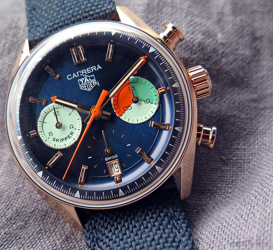 The TAG Heuer Carrera Chronograph Skipper Rose Gold comes on a blue textile strap with a rose gold pin buckle and has an RRP of CHF 21,000/ AUD 31,150.