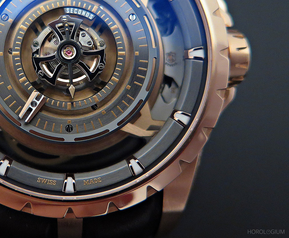 The multi-level dial displays hours, minutes and seconds alongside highlighting the monotourbillon. There is a grey double surface flange, satin-brushed, with transferred texts, and polished rose gold-plated hour markers with Super-LumiNova. The double surface disc is also grey, with a mix of satin-brushed and mirror polishing, with transferred texts and minutes markers. Then there is another satin-brushed grey disc with transferred texts and seconds markers. The open-worked hour and minute hands are brass rose gold-plated, satin-brushed, and have Super-LumiNova on inner faces, and fixed on a rotating disc.