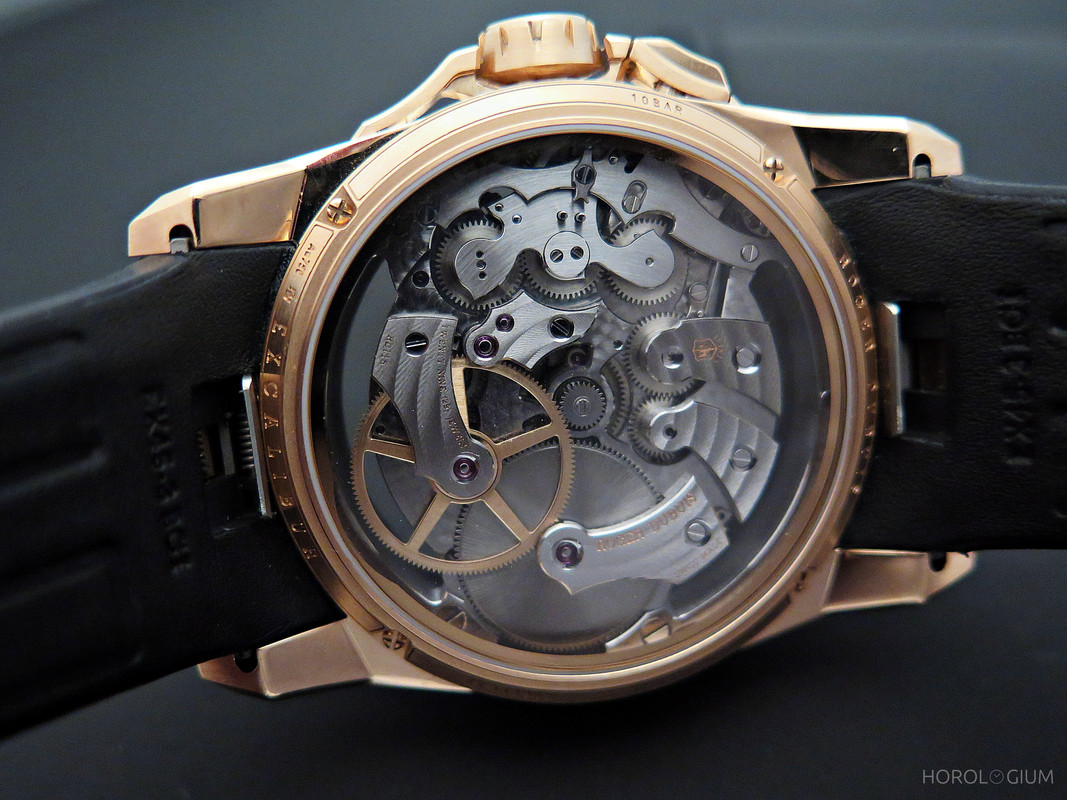 Coming on a calf leather strap with a triple-folding clasp with a pink gold cover and titanium blades, it has the QRS quick release system, it is limited to eight-eight pieces. It does appear big in both diametre and in heft, but it is comfortable on the wrist.