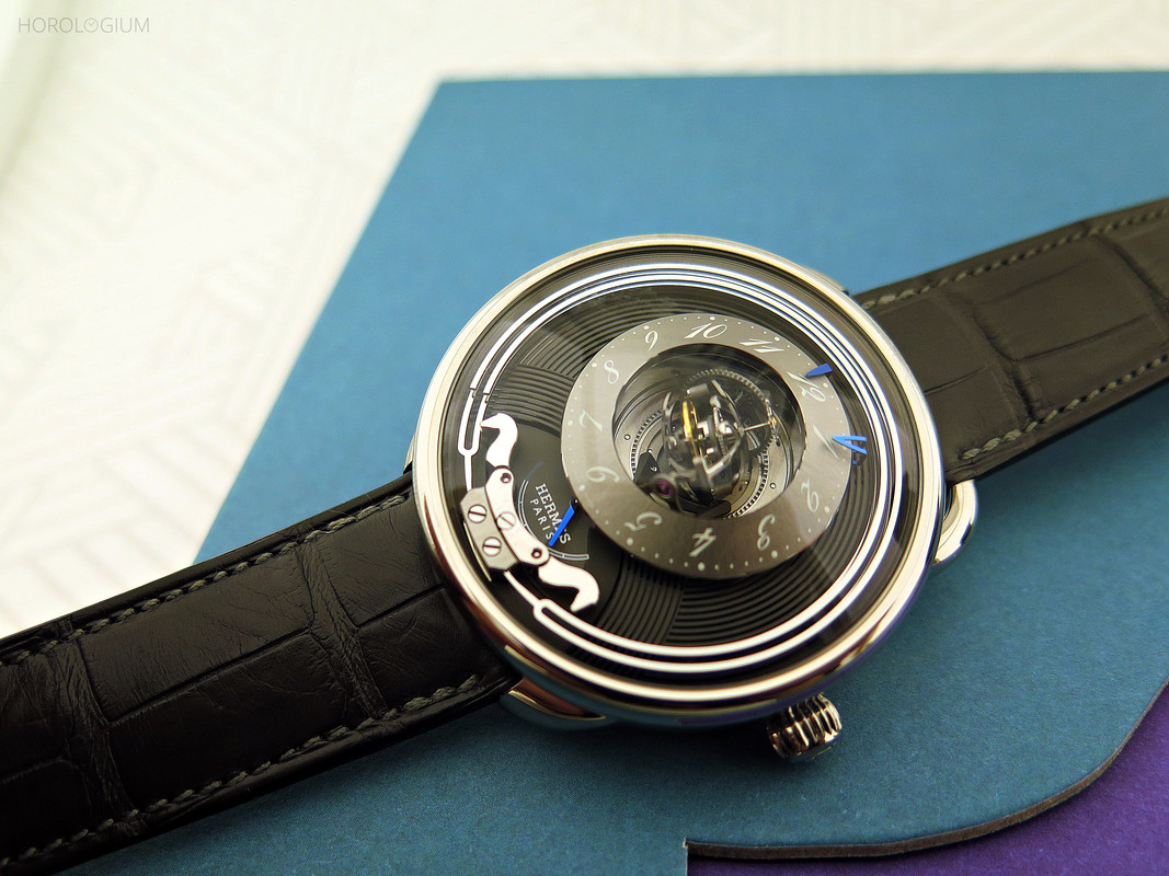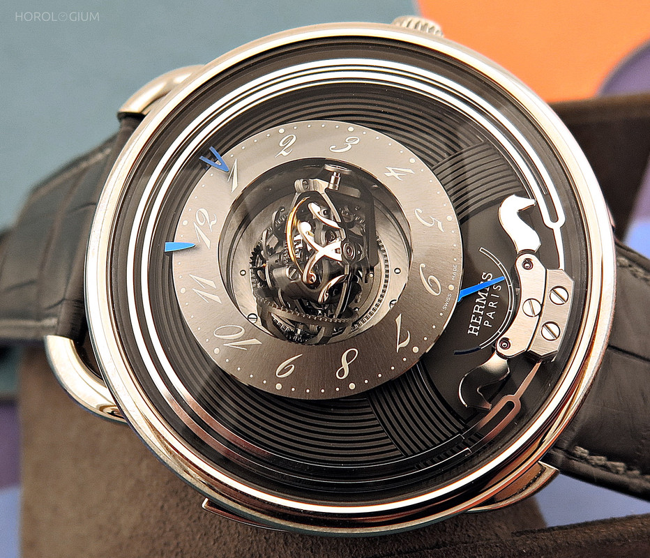 The central triple-axis tourbillon has ninety-nine components and a mirror-polished titanium carriage shaped with a double ‘H’ (representing the union of Émile Hermès and Julie Hollande in 1900) covering it. The rotation speeds of the three axes are one full turn in 300, 60 and 25 seconds.