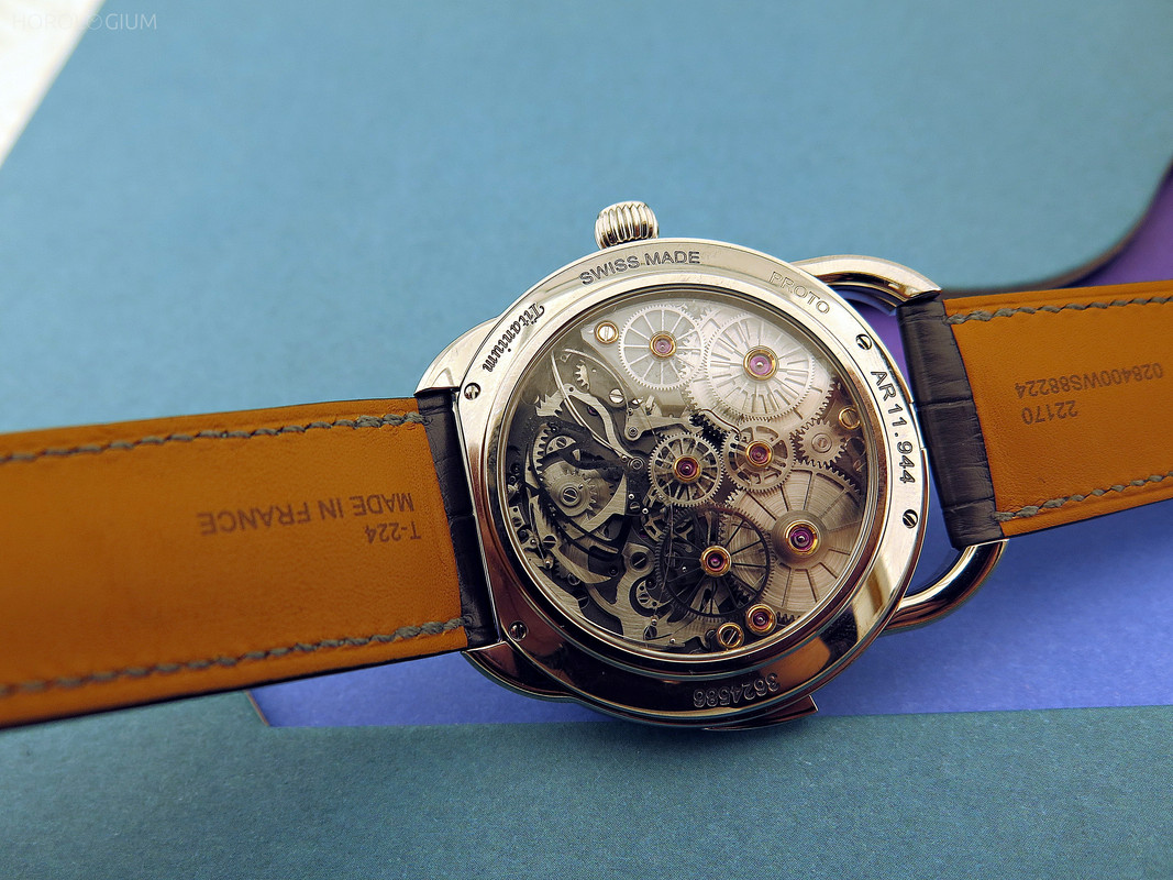 The minute repeater chimes the hours, quarter-hours and minutes, with U-shaped ‘tuning-fork’ gongs and mirror-polished horse head-shaped hammers. The gears feature a cut-out design inspired by the wheels of the Duc Attelé horse-drawn carriage. The mainplate and bridges have anthracite PVD treatment, horse head-and-mane shaped repeater mechanism, and toothed wheels. The open-worked sapphire-crystal strike work bridge is to enhance the sound of the repeater.