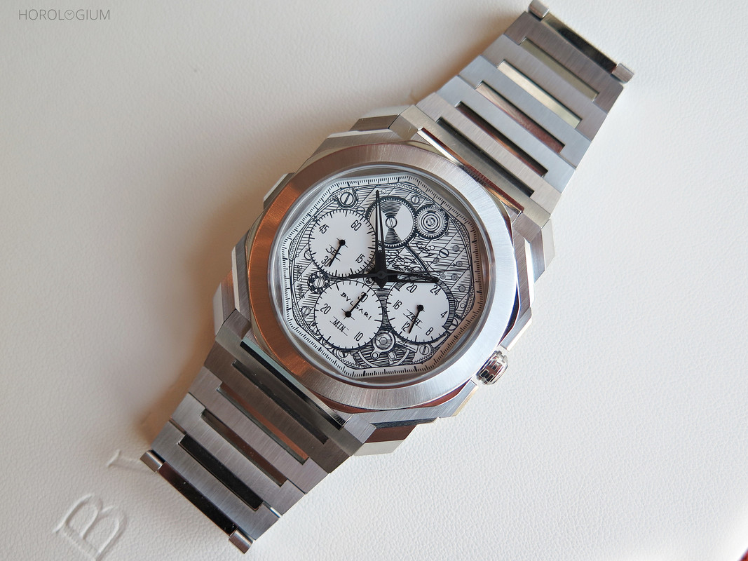 There was also a single image that was released at that point, of the Ref 104192 Octo Finissimo Chronograph GMT Sketch. In a tri-compax format, it has a central seconds hand, 30-minute chronograph, second time zone at 3 o’clock, and small seconds at 9 o’clock. It will be in a 43mm steel case with a mix of polished and satin-brushed finishing.