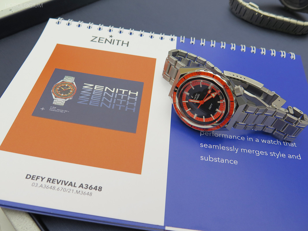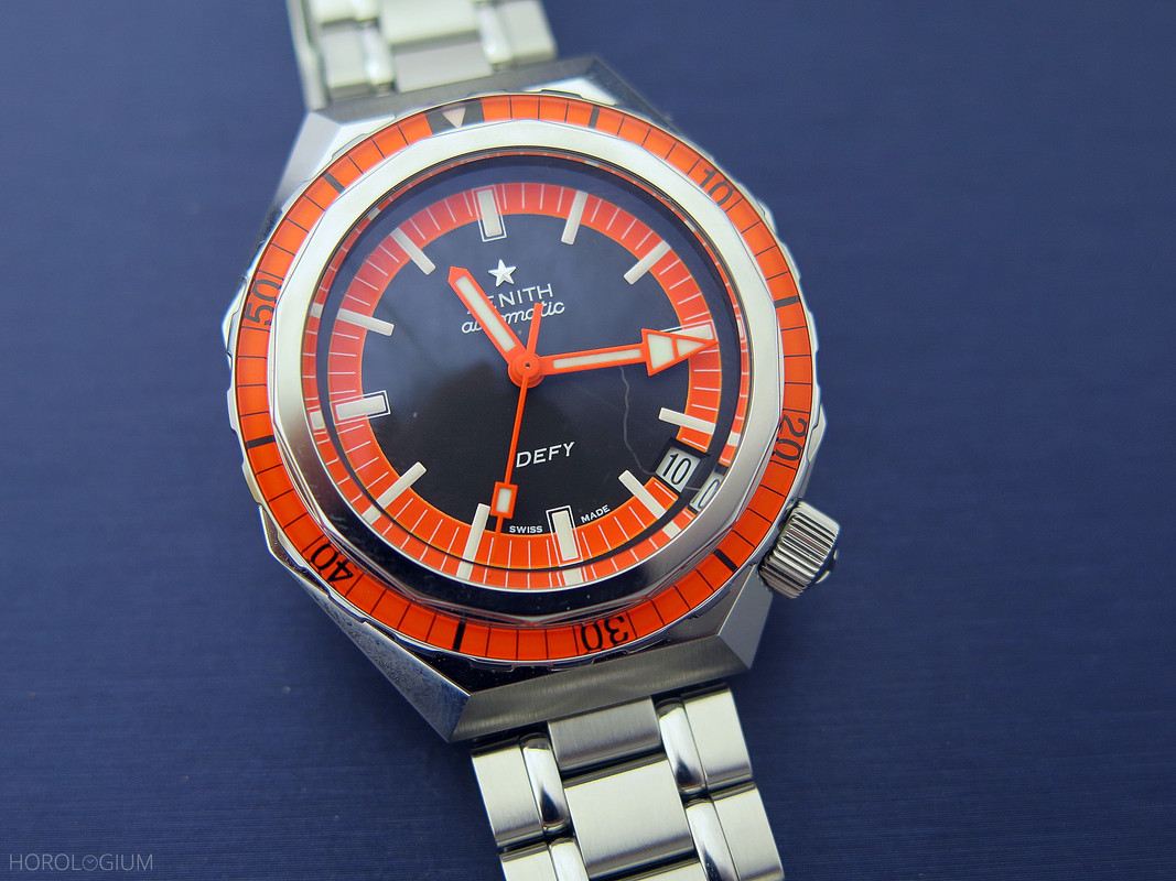 This new model is, unsurprisingly given the other Zenith Revival pieces, very faithful (with some obvious updates) to the original, with the same case metal and shape, although now 37mm (15.5mm thick), same unidirectional rotating fourteen-sided bezel above the round rotating bezel, same colour scheme, same hands, date window, and lumed hour markers and hands. It even has the same 600m water resistance.