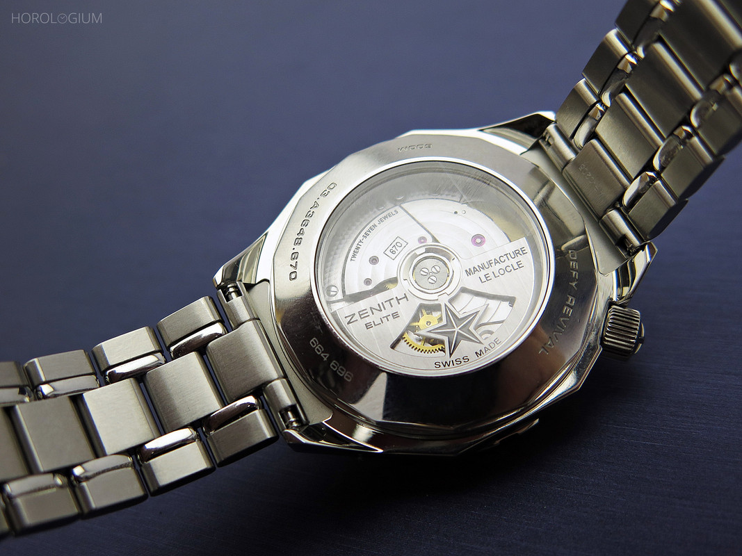 Through the now open sapphire case back is the automatic Elite 670 movement. With Côtes de Genève decoration on the oscillating weight, it beats at 28,800 VPH and has a power reserve of 50 hours.