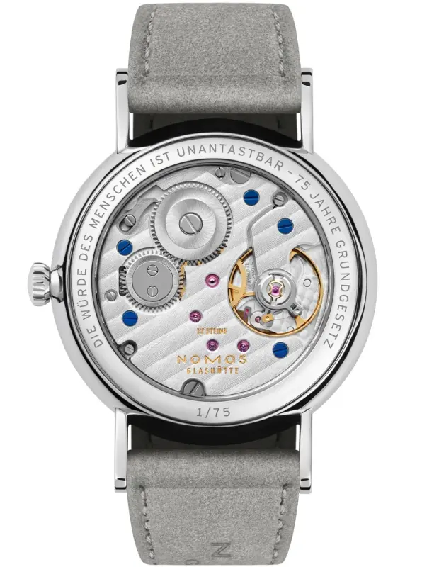 Through the sapphire case backs can be seen the in-house NOMOS movements. The Ludwig 33 – 75 Jahre Grundgesetz, Ludwig – 75 Jahre Grundgesetz and Ludwig 38 – 75 Jahre Grundgesetz are all powered by the manually-wound Alpha calibre which has 43 hours of power reserve. The Ludwig neomatik – 75 Jahre Grundgesetz and Ludwig neomatik 39 – 75 Jahre Grundgesetz are both powered by the DUW 3001 which has 43 hours of power reserve and the largest model in this edition, the Ludwig neomatik 41 Datum – 75 Jahre Grundgesetz, has the DUW 6101 with 42 hours of power reserve