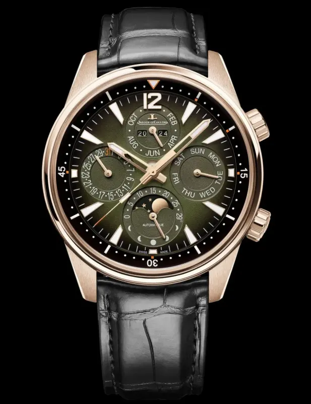 In a 42mm sized pink gold case with a thickness of 11.95mm and water resistance of 100m, its lacquered gradient dial is green. The functions in the recessed sub dials are the perpetual calendar of the name, featuring the day, date, month and year, moonphase (both hemispheres), and an inner rotating bezel. features a red “security zone” on the dial to remind you not to make date changes between eight PM and four AM.