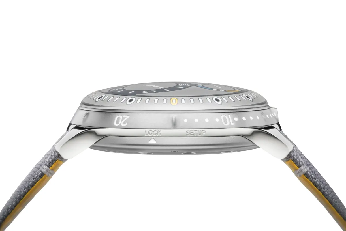 The TYPE 5 L comes on a grey fabric strap with yellow lining with an ardillon buckle and you get an extra blue rubber strap. It has an RRP of June 2024 CHF 34,500 (excluding taxes).