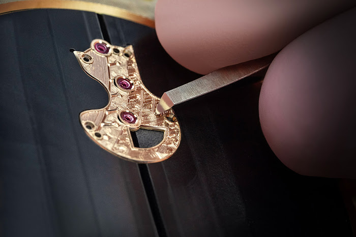This movement is in large part also about the decoration. The bridge plate and island bridges are rather splendidly hand-engraved in relief with an overhead street scene of Breguet’s workshop at 39 Quai de l’Horloge as it would have been at the time. The grey components are created using a combination of black and white rhodium plating.