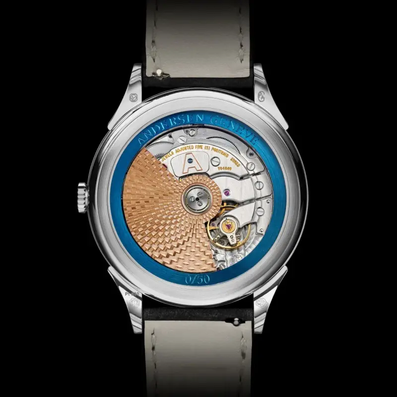 You may recall this particular feature from previous models, but surrounding the movement is a 21k BlueGold ring. It is hand-engraved with ‘Andersen Genève’ and the xx/50 limitation number.