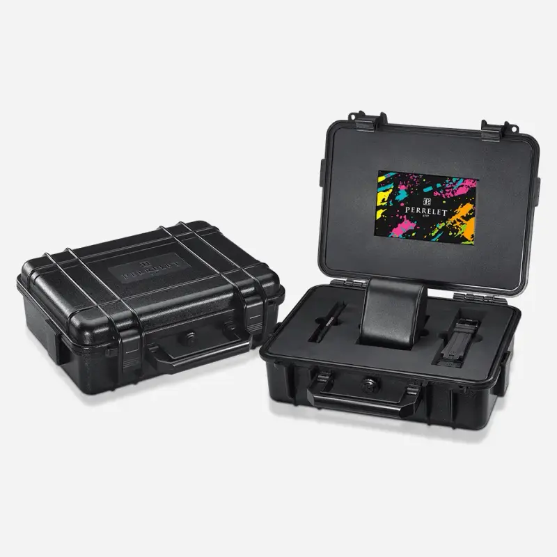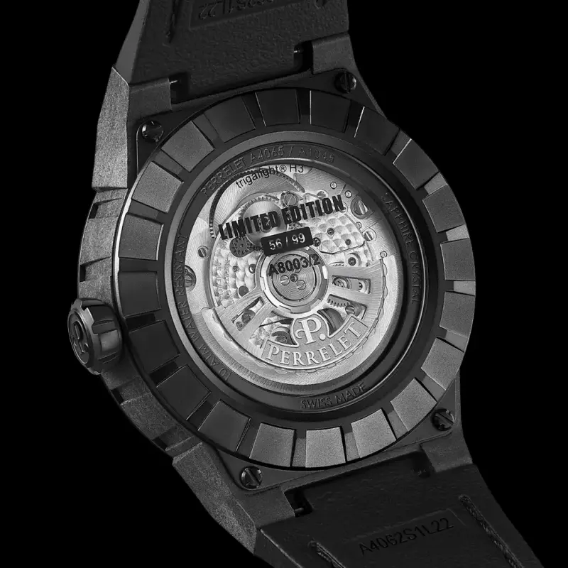 Coming on a black calf leather strap with alligator pattern and rubber lining with a folding clasp in black PVD steel with Perrelet logo, the Perrelet Turbine Splash comes in a tactical box with an additional black rubber strap and a fastening tool. In a numbered limited edition of ninety-nine pieces and with an RRP of EUR 5,200, it is available both from authorised retailers and directly from the brand.