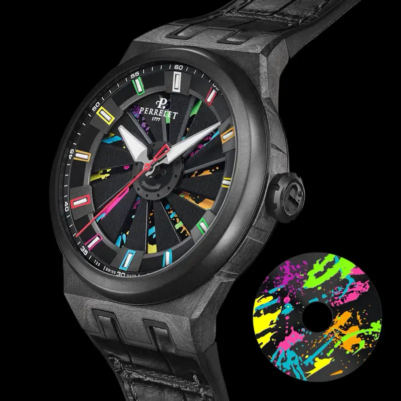 The new Perrelet Turbine Splash is not named for aquatic sports, nor is it summer-themed. The Splash name is actually a reference to the ‘splashes’of colours used on the lower dial, and the manner in which they have been applied – the dial, with its double rotor and familiar twelve-bladed turbine, which for this model are made from black anodised aluminium with five tungsten counterweights, features ‘splashes’ of colour inspired by the work of Jackson Pollock.