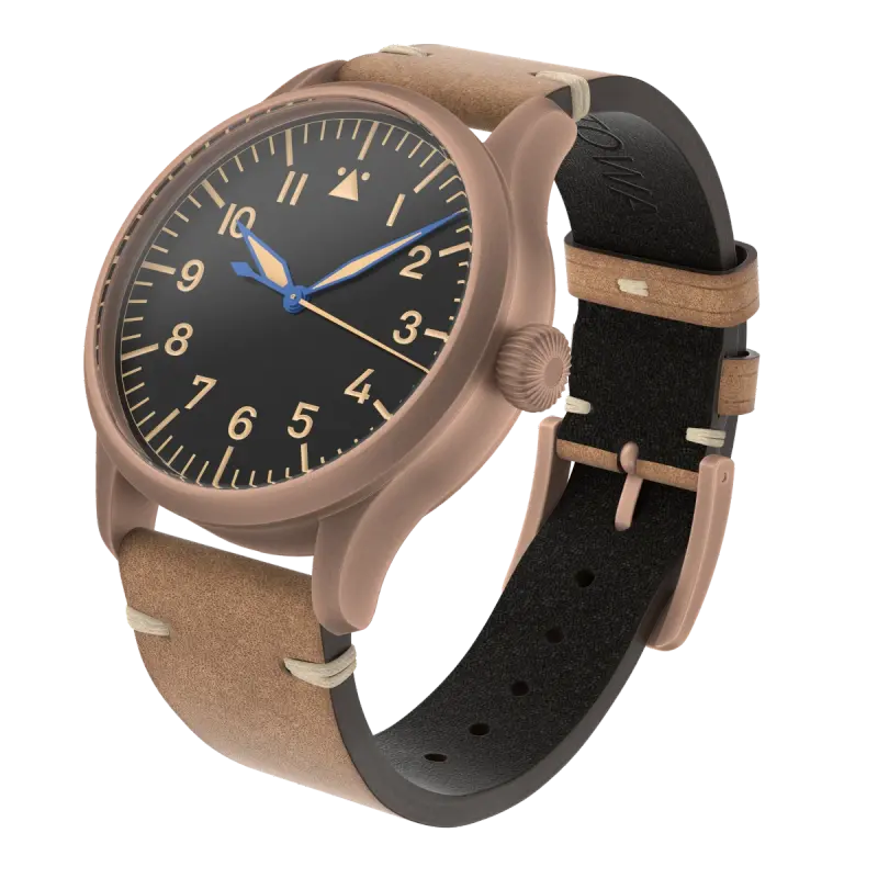 Finally, there is the Flieger Olymp Bronze, which is limited to 18 pieces. In a 41mm (12.8mm thick) bronze (CuSn8) case with water resistance of 50m, its black dial is available with either a white or Old Radium numbers, markers, and hands/ Super-LumiNova colour.