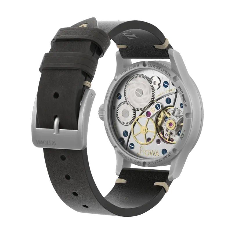 They are all powered by the manually-wound Stowa M1. Based on the Unitas 6498-1, the M1 has been converted to a central second hand. Beating at 18,800 VPH with a power reserve of 46 hours, the movement has converted to a central second hand with the new bridges are decorated with an off-centre sunray-shaped stripe cut starting from the balance.
