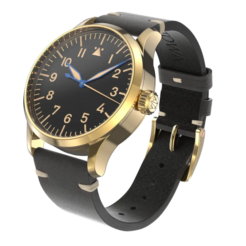 The Flieger Olymp Gold Limited is in a limited edition of three pieces in a polished 750/000 gold 41mm sized (12.8mm thick) case with water resistance of 50m. The dial is black, and the hands are blued, with Old Radium Super-LumiNova.