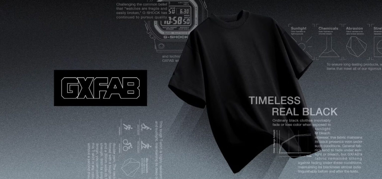 To reduce colour fading, the GXFAB t-shirt uses a thread with pigments mixed in at the raw material stage rather than dyeing the fabric. The material is not, however, cotton, but polyester. Further to the colour fading, Casio says that this new GXFAB material performs similarly to black dyed black polyester when tested on strong chemicals like undiluted chlorine bleach, which was used to test its colorfastness.