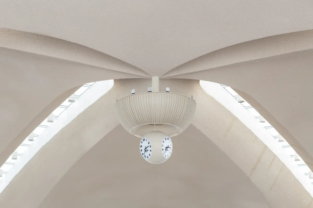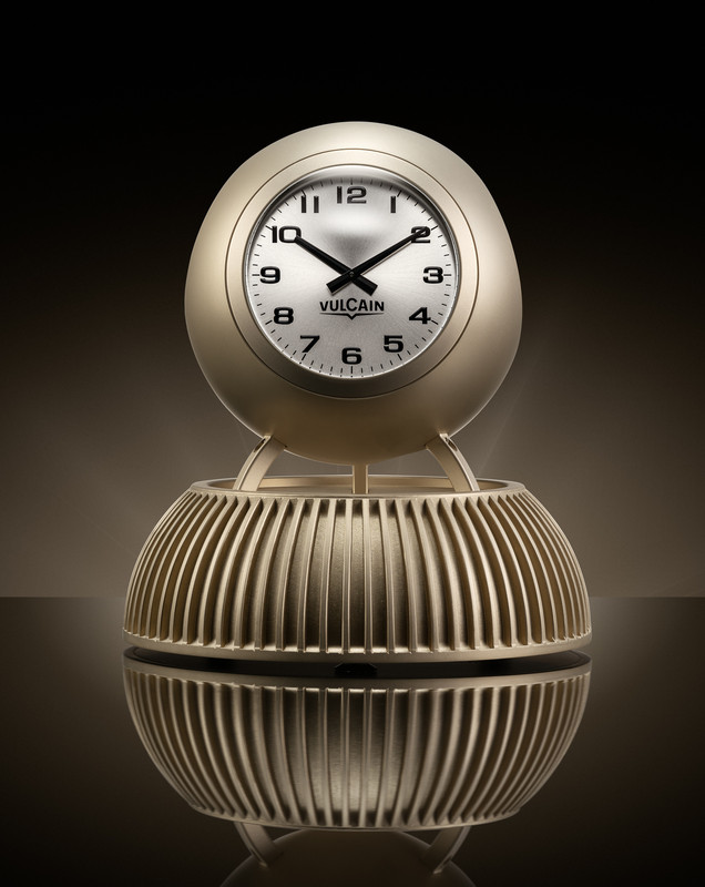 Suspended from the Flight Center’s lobby is a three-sided Vulcain clock that was added after the building’s opening in 1962, and it is this clock which has been reinterpreted (basically turned upside down so that there is a base) into a table-friendly form.