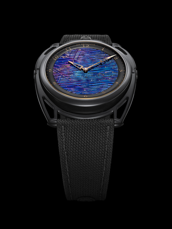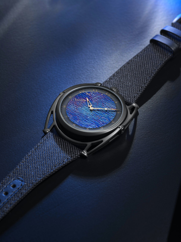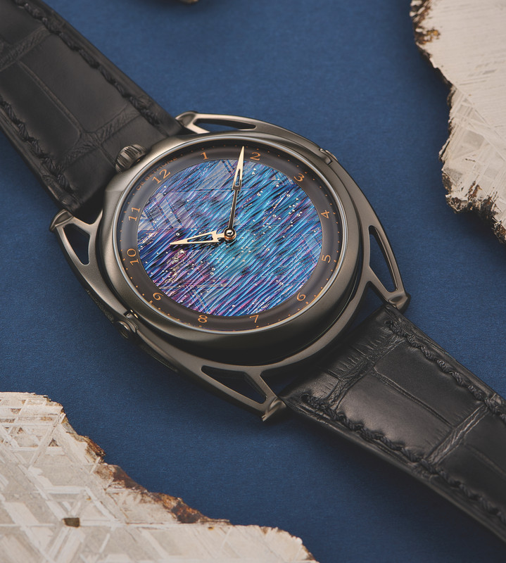 De Bethune has launched the new DB28xs Aérolite, with a blued Muonionalusta meteorite dial featuring a random guilloché pattern that represents the rippled surface of a sea (albeit with ‘stars’on it). This new piece is a close relation of the DB28xs Starry Seas, which comes in a grade 5 titanium case with its blued titanium dial with a random guilloché pattern in white gold representing a star-filled sky. You can read more about that it at this link.